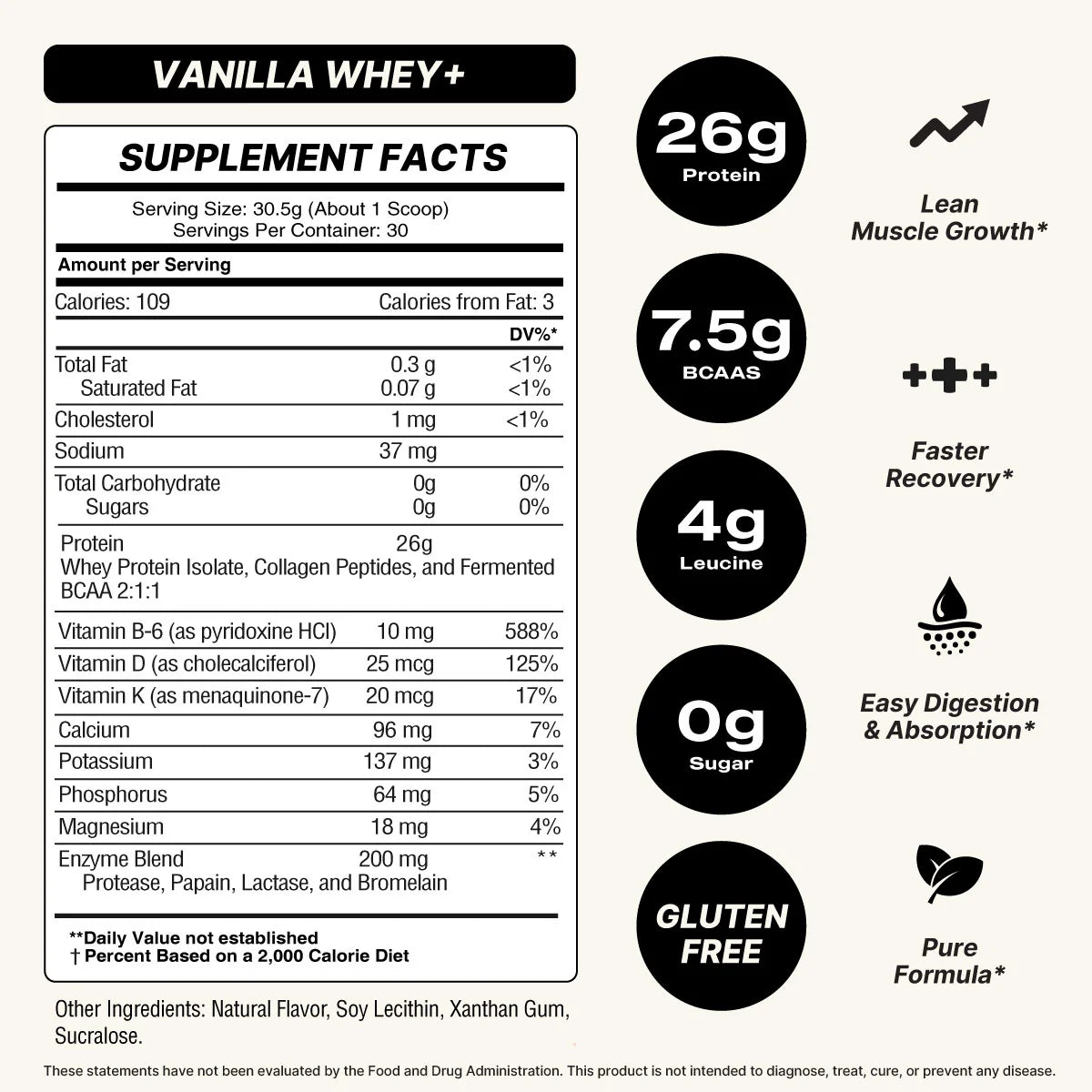 Protein 26 g, Whey Protein Isolate 23.7 g, Collagen Peptides 3.0 g, Added Fermented BCAA 2:1:1 2.0 g, Magnesium 18 mg, Vitamin B-6 10 mg, Vitamin D 25 mcg, Vitamin K 20 mcg, Calcium 96 mg, Potassium 137 mg, Phosphorus 64 mg, Enzyme Blend: 200 mg (Protease, Papain,Lactase, and Bromelain)