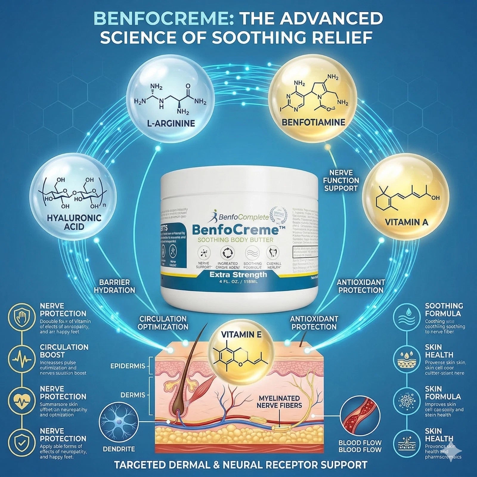 Extra Strength BenfoCreme™ Body Butter is a topical preparation of Benfotiamine (Vitamin B-1), L-Arginine HCL and Vitamins E and A. It is an excellent adjunct to the capsules. It is to be applied as needed to affected areas. Some customers use it exclusively with good results, but most use it in addition to the Benfotiamine capsules.